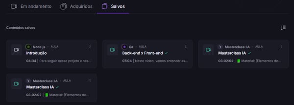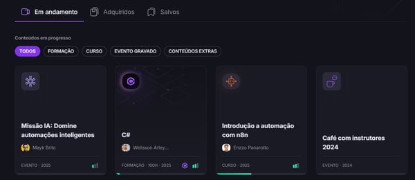 Nesse campo, você pode acompanhar todos os conteúdos que estão em andamento na plataforma. É possível reunir conteúdos de diversos tipos: formações, cursos, eventos gravados e conteúdos extras.