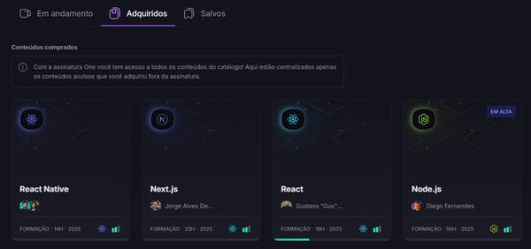 Nesse campo, é possível visualizar todos os conteúdos adquiridos na plataforma. É importante lembrar que, com a assinatura do Rocketseat ONE, você tem acesso a todos os conteúdos do catálogo e nessa página estão centralizados apenas os conteúdos avulsos que foram adquiridos fora da assinatura.